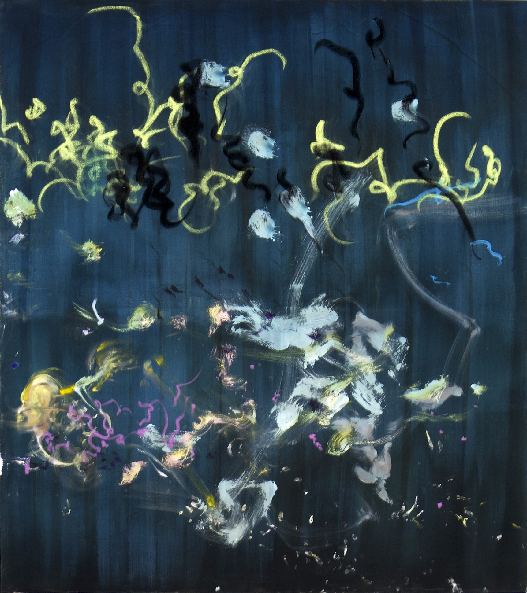 Oil, fabric painting, oil paint sticks and watercolour on canvas