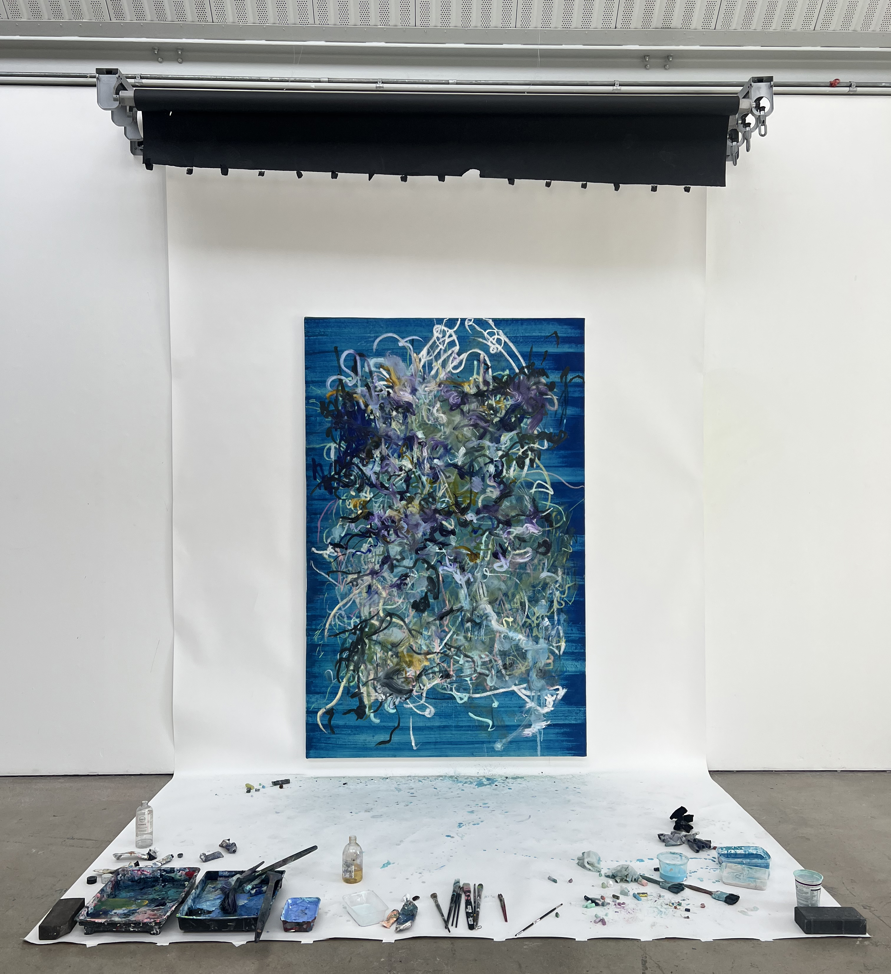 Using chalk pastels, acrylic and oil onto a streched canvas with a watercolour underpainting and textured ground, the painting unfolded through spontaneous disruptions involving risk, control, imperfection, and unity. The result is a painting, its documentation - but also a process: a hand-made negotiation between thought and flow, craft and catastrophe, conscious control and the practice of letting go.