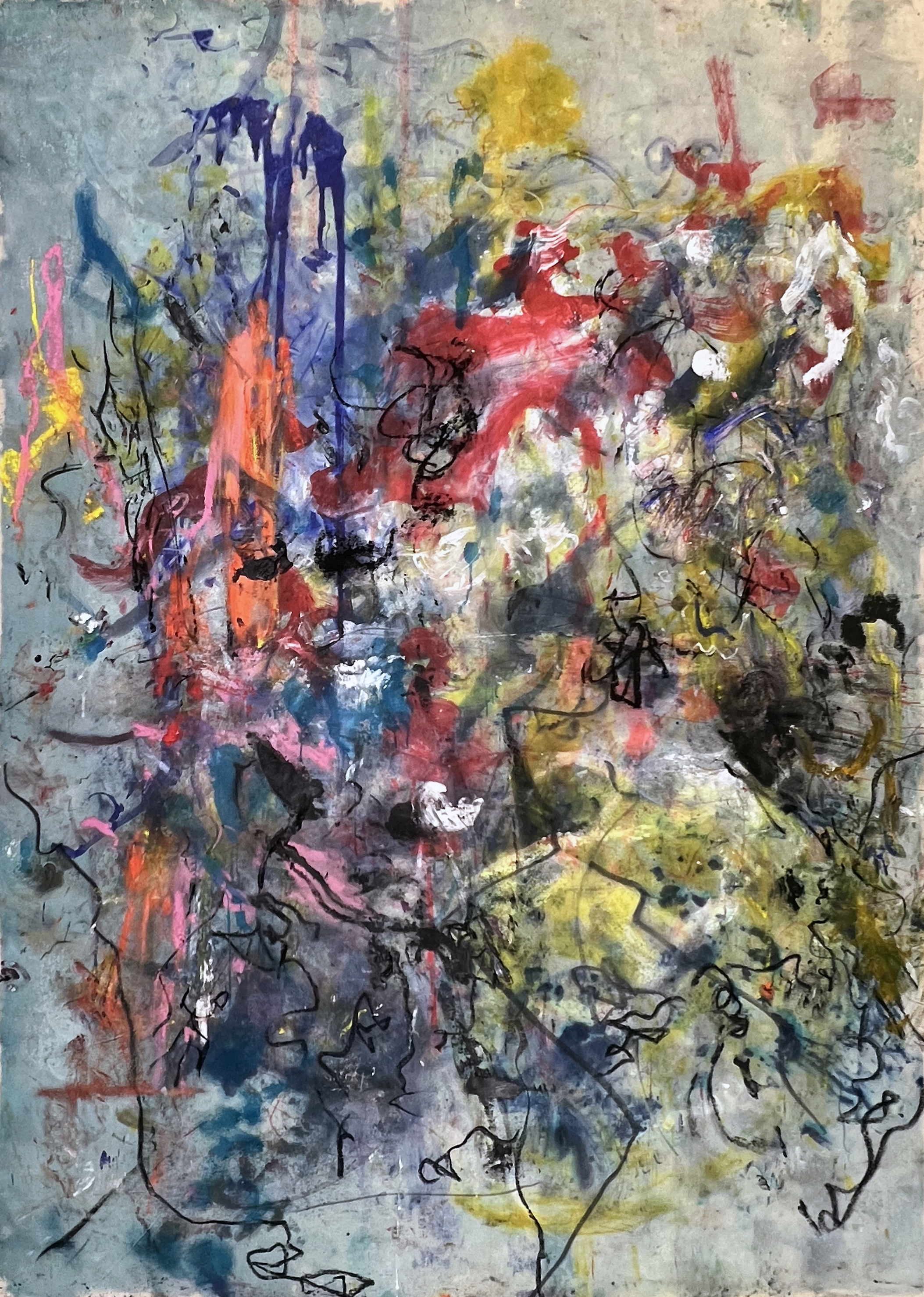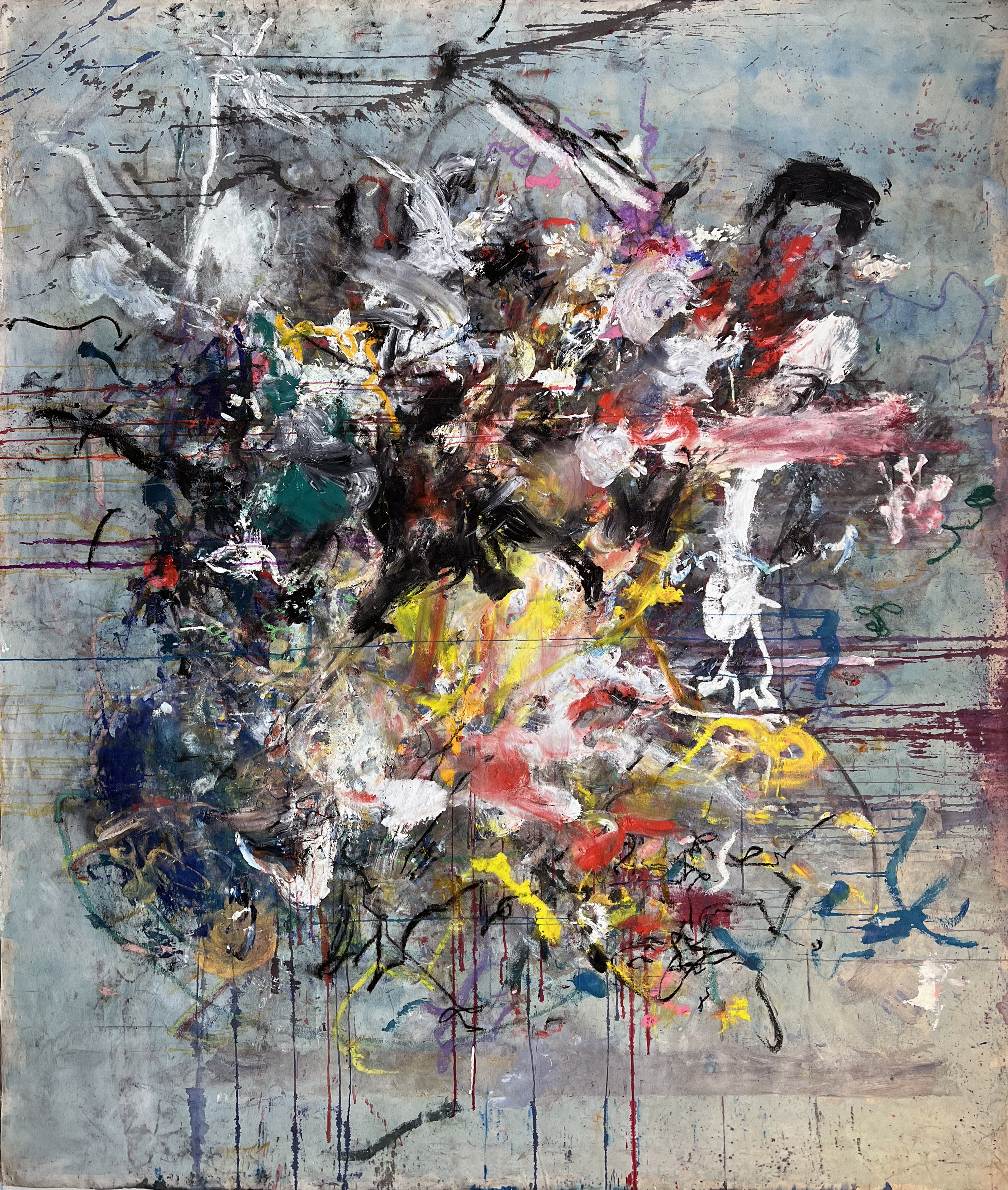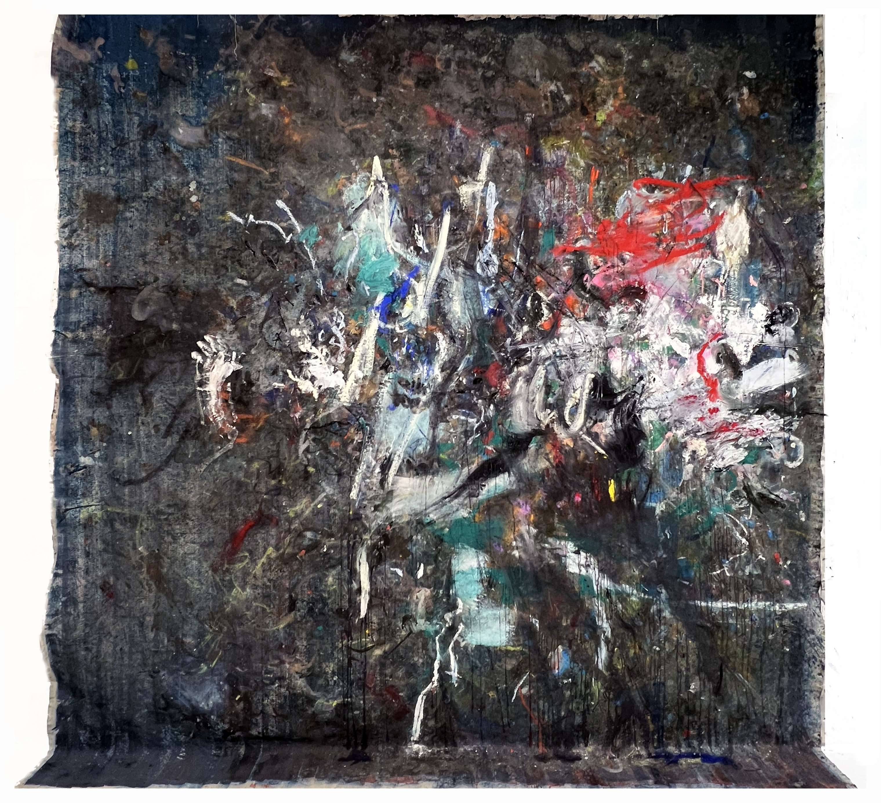 Oil, fabric painting, oil paint sticks and watercolour on canvas